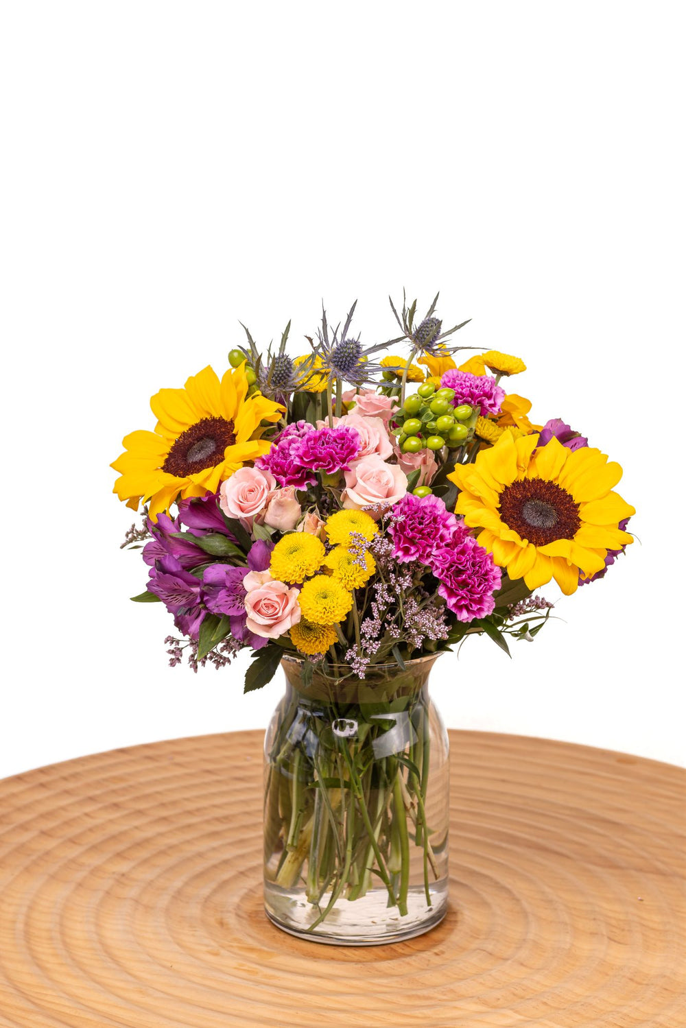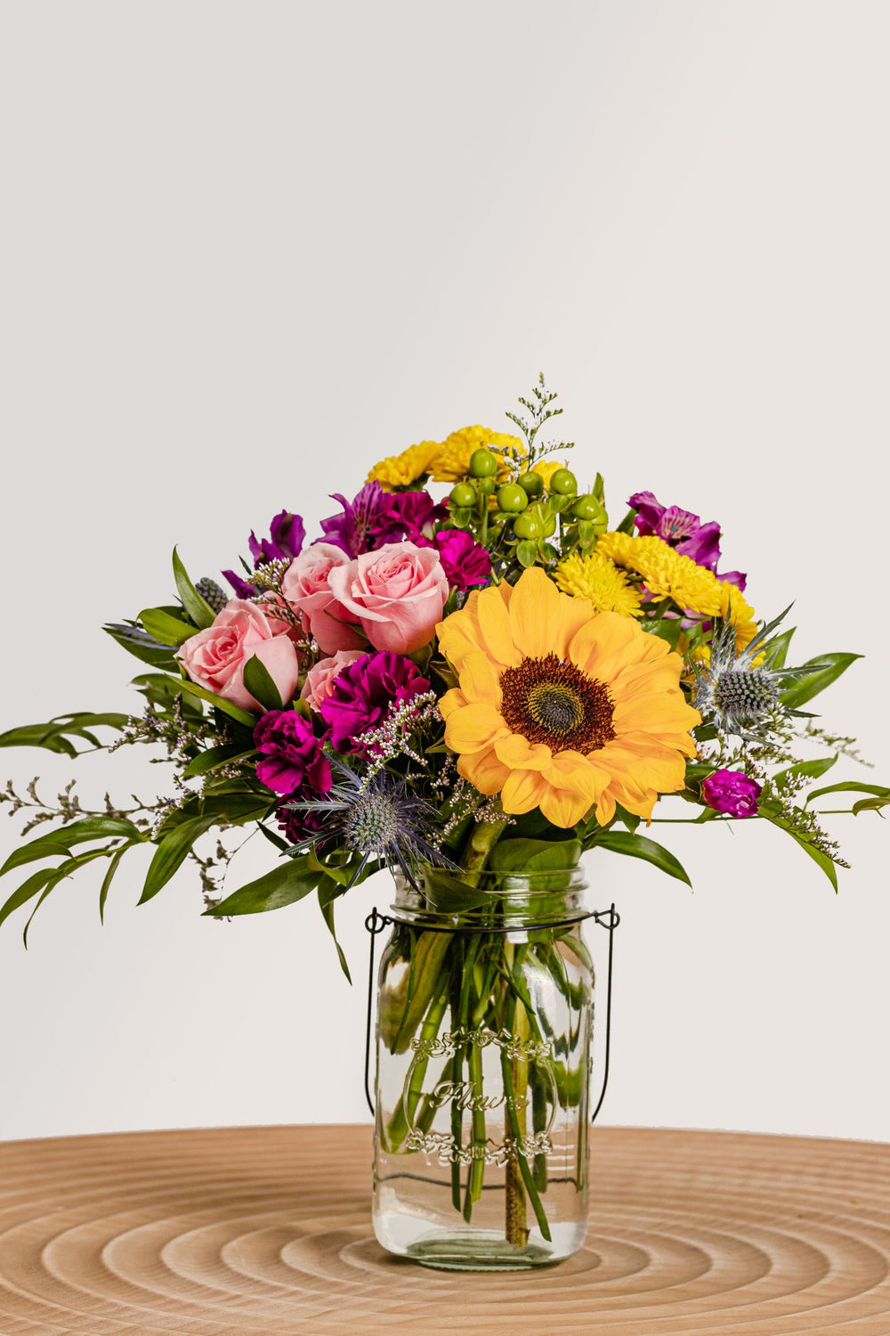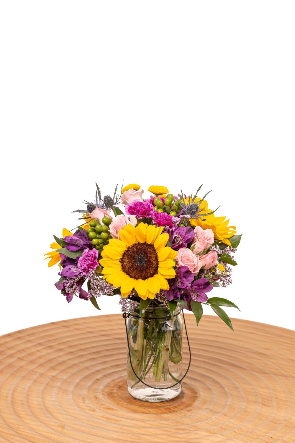 A rainbow of colors in one Mason jar. That's what you'll get with The Mallory flower arrangement! It's perfect for any occasion, from birthdays and anniversaries to promotions and holidays. A lovely mix of carnations, alstroemeria, and sunflowers, it's sure to brighten anyone's day. So brighten up your loved ones' day with this beautiful bouquet today!