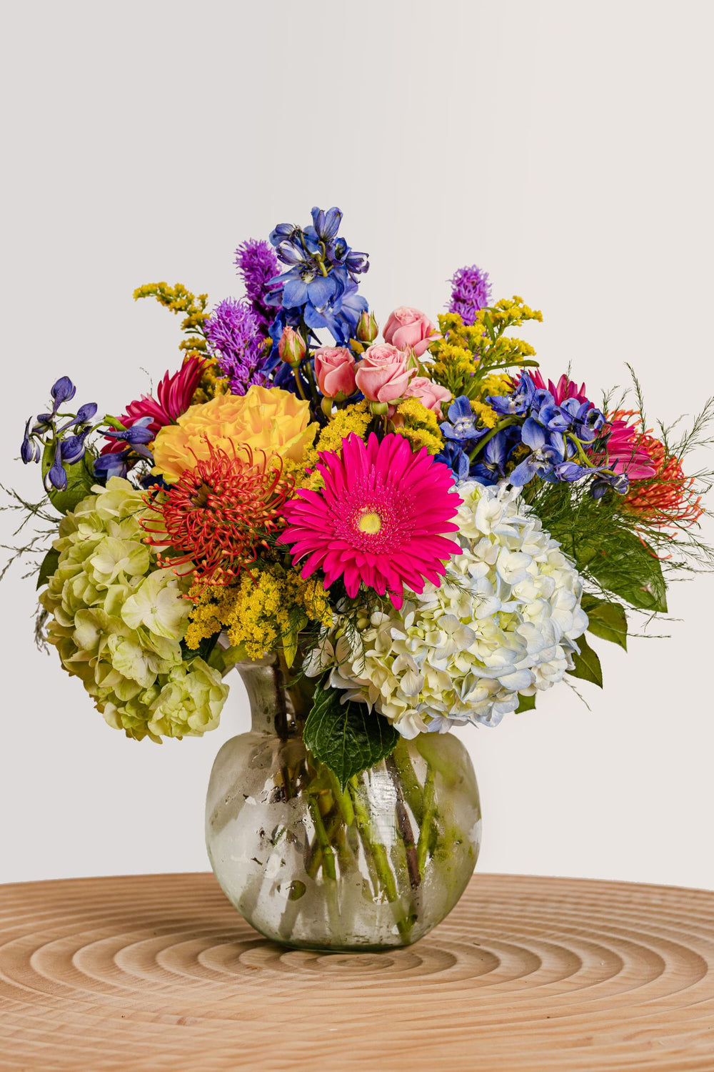 Who says flowers have to be boring? The Michelle arrangement is perfect for anyone who wants to add a little fun and color to their life. This vibrant arrangement features a hydrangea and an array of roses in a variety of colors. It's the perfect way to say "happy birthday," "congratulations," or "I love you."