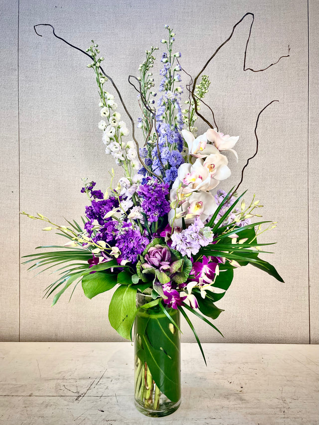 Love Lavender? 50 Shades of Lavender Bouquet combines purples and lavenders for an intriguing design. Filled with lavender toned orchids, stock, kale and delphinium accented by silver and pink toned foliages. Intrigue someone today!