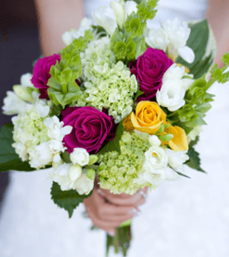 Invite the beauty of the English countryside. Colorful mix of Roses accent with Green hy, Bells of Ireland, Tulips and Freesia