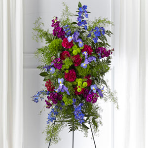 This colorful spray is a modern and refreshing mix that brings serenity to those who experience a loss. Our Heavenly Skies™ Standing Spray is crafted with a beautiful blend of stock, iris, dianthus and delphinium reminiscent of a hopeful wildflower garden.