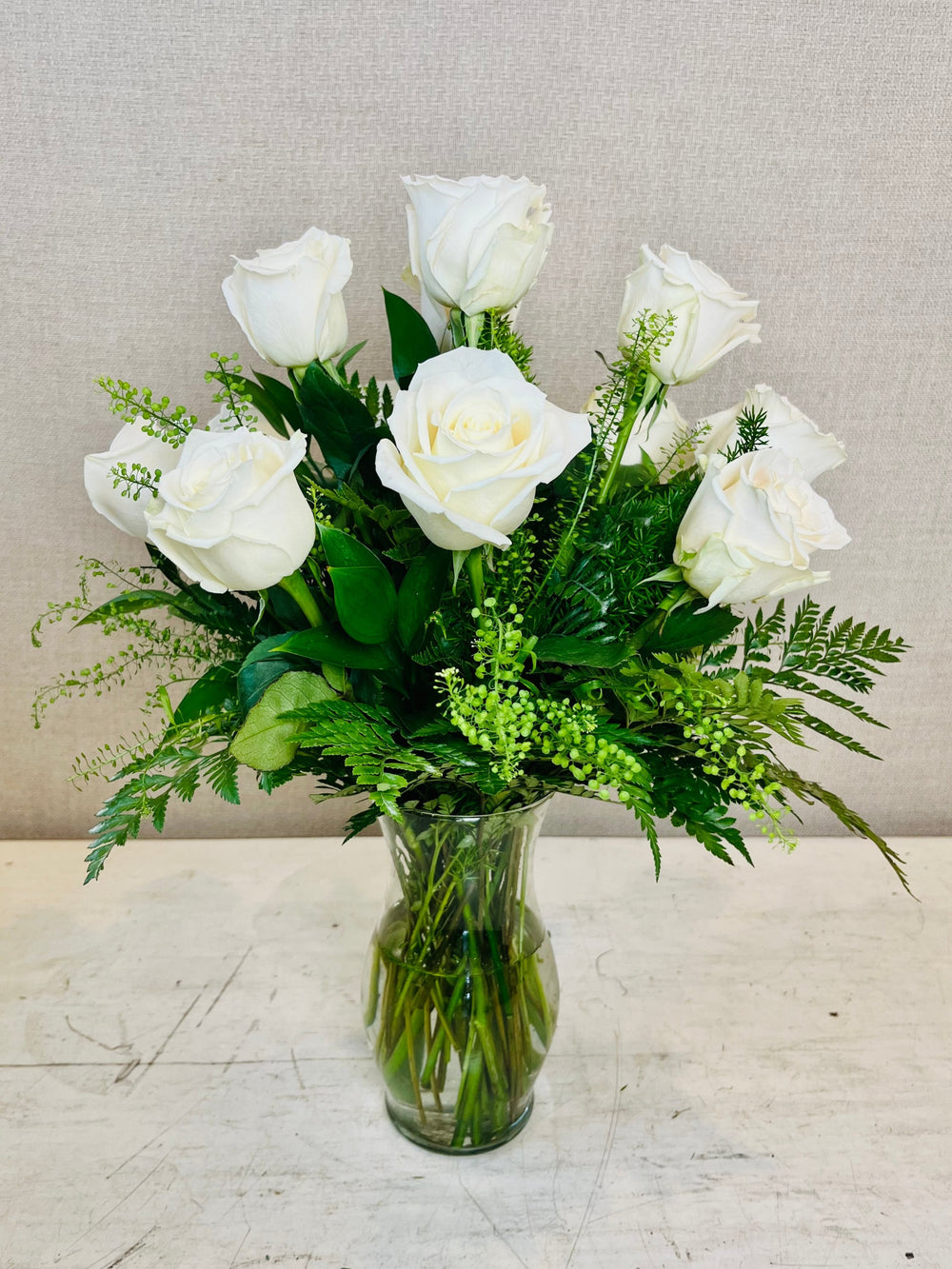The beauty of white roses is unchallenged. Representing innocence, their versatility makes them a favorite gift to offer congratulations for graduation, engagements, bridal showers, new baby, or even a gift of sympathy. This white rose bouquet is accented with seeded eucalyptus and arranged in a simple glass vase.