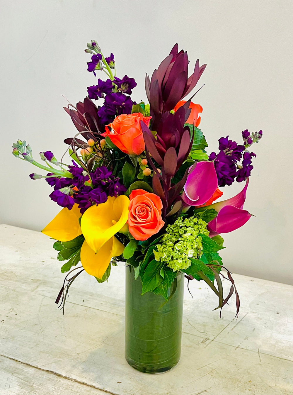 Calla lilies, purple stock, peach hypericum, safari sunet and orange roses are a colorful and complementary mix of flowers in this modern design. Green mini hydrangeas provide a neutral backdrop to set off the rich purple and orange tones.