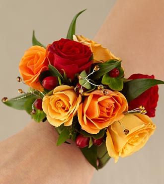 The FTD Sweet Sunshine Wristlet is a ray of warm sunshine to honor any special woman. Red, orange and yellow spray roses are accented with red hypericum berries, lush greens, and topaz rhinestone pics are perfectly arranged on a wristlet covered with a sage grosgrain ribbon for an incredible look. Approximately 5"H x 3"W.